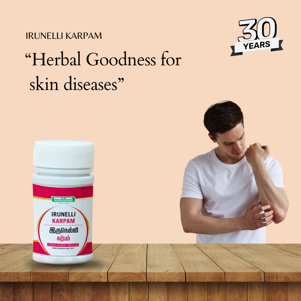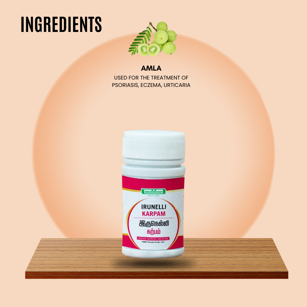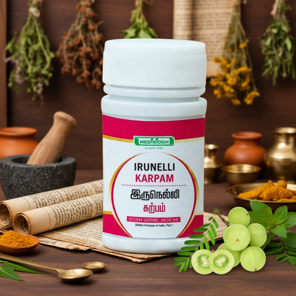 Iru Nelli Karpam is a traditional Siddha formulation made with Nellikai (Phyllanthus emblica) and Kanthagam (Sulphur). Carefully processed using time-tested methods, this herbo-mineral preparation is valued in Siddha medicine for its role in supporting skin wellness, detoxification, and overall balance.