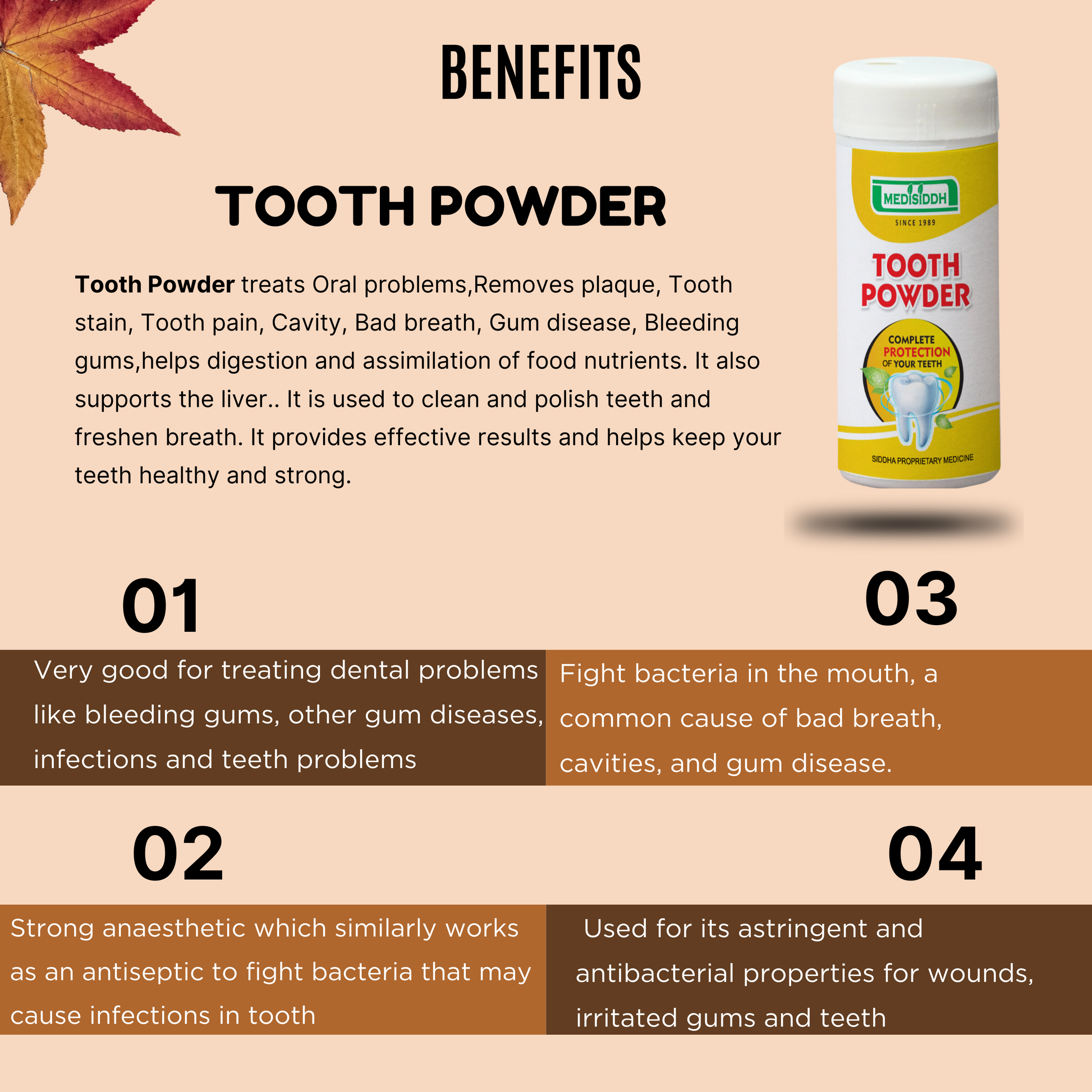 Tooth Powder treats Oral problems,Removes plaque, Tooth stain, Tooth pain, Cavity, Bad breath, Gum disease, Bleeding gums,helps digestion and assimilation of food nutrients. It also supports the liver.. It is used to clean and polish teeth and freshen breath. It provides effective results and helps keep your teeth healthy and strong.